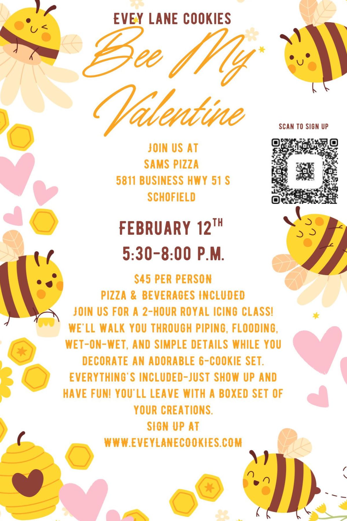 Get ready for the sweetest Valentine’s Day fun! Join us for our Bee My Valentine Cookie Decorating Class, where you’ll decorate six adorable sugar cookies featuring bees, beehives, hearts, and Valentine-inspired designs.