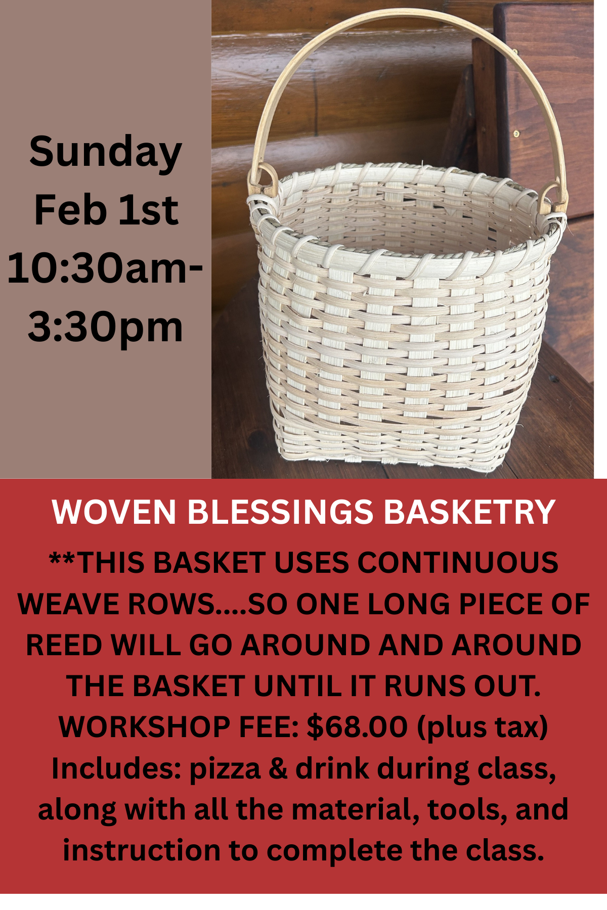 WORKSHOP FEE: $68.00 (plus tax) Includes: pizza & drink during class, along with all the material, tools, and instruction to complete the class.